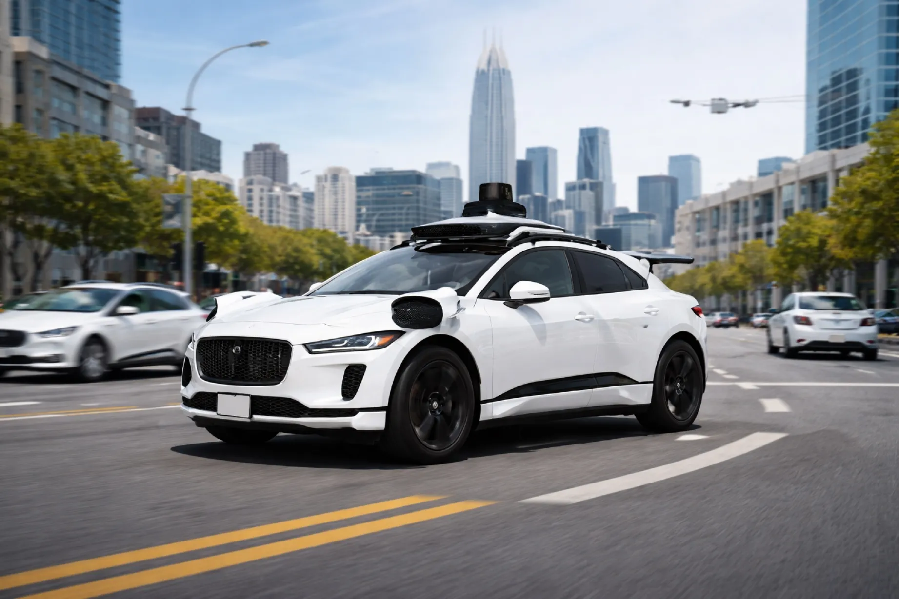 Robotaxis y autos autónomos circulando por ciudad moderna